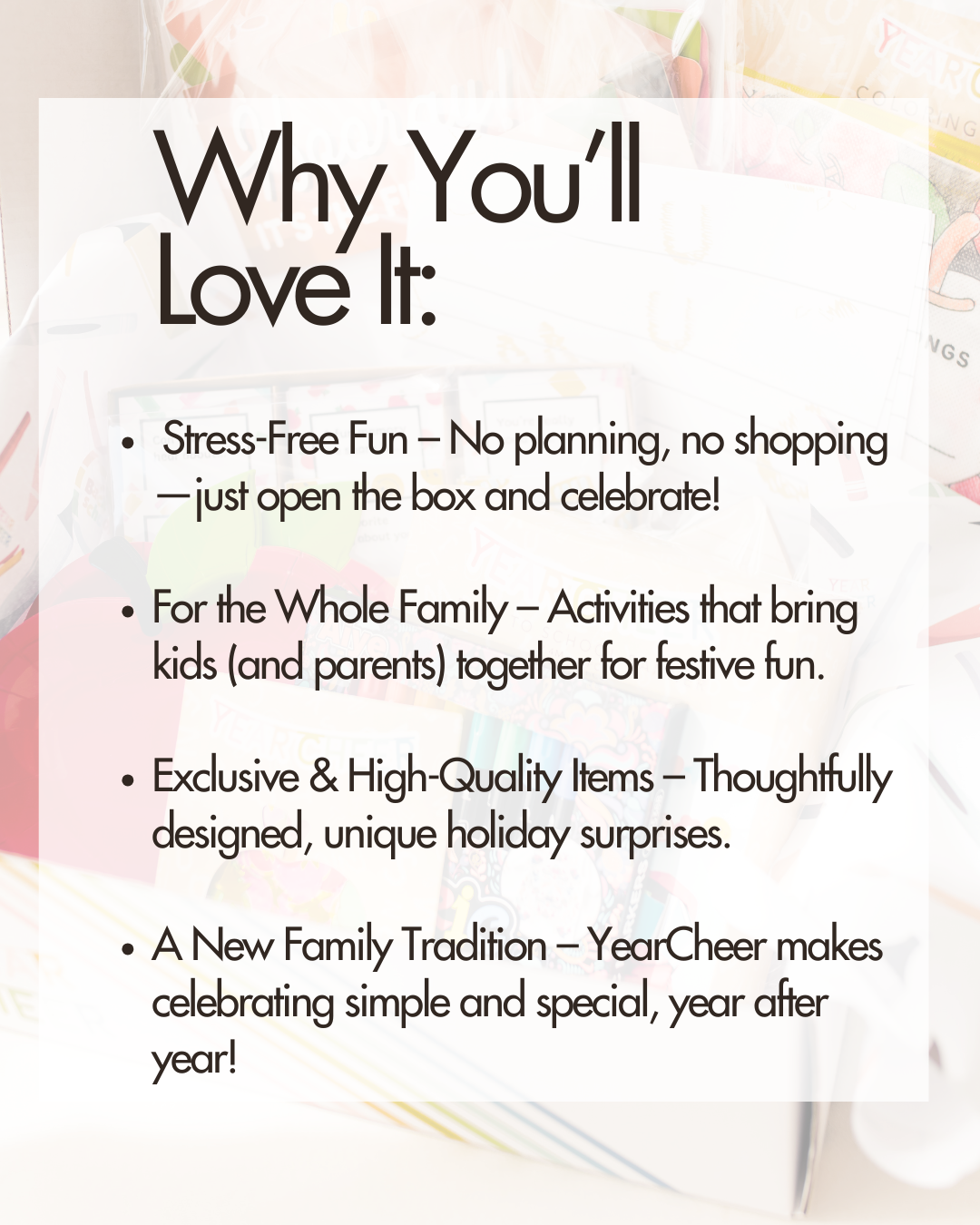 Celebrate Thanksgiving with everything you need to decorate, connect, and make lasting family memories—without the stress of planning. The YearCheer Thanksgiving Box is filled with hands-on crafts, festive décor, and playful games designed to spark gratitude, laughter, and togetherness.