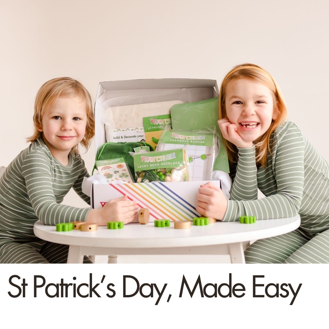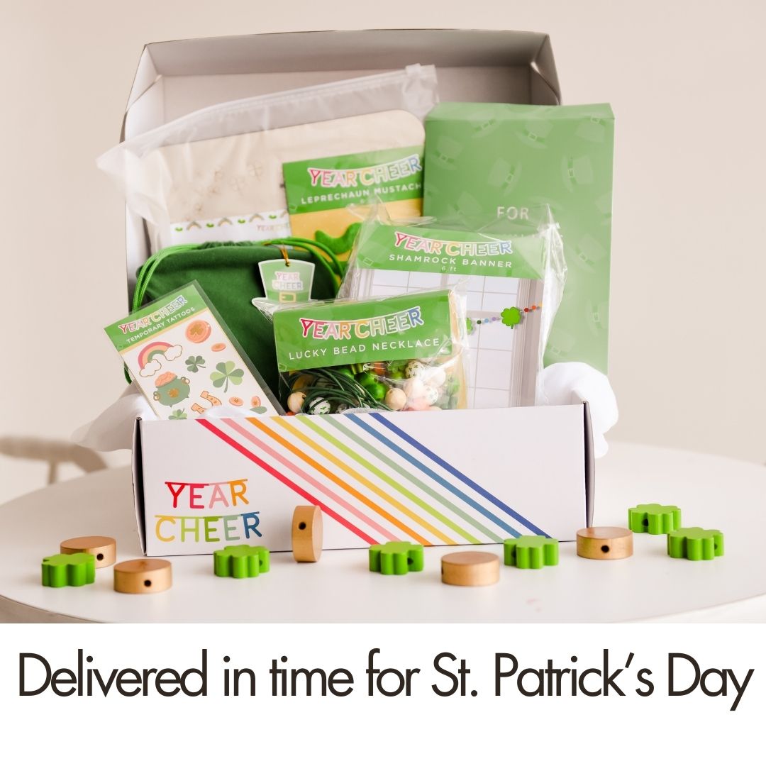The YearCheer St. Patrick’s Day Box makes it easy to join in — with everything thoughtfully planned, prepped, and packed for you. Inside, you’ll decorate together, play simple games, create festive green accessories, and work as a family to trap a leprechaun (because a little silliness goes a long way).