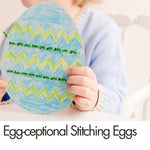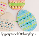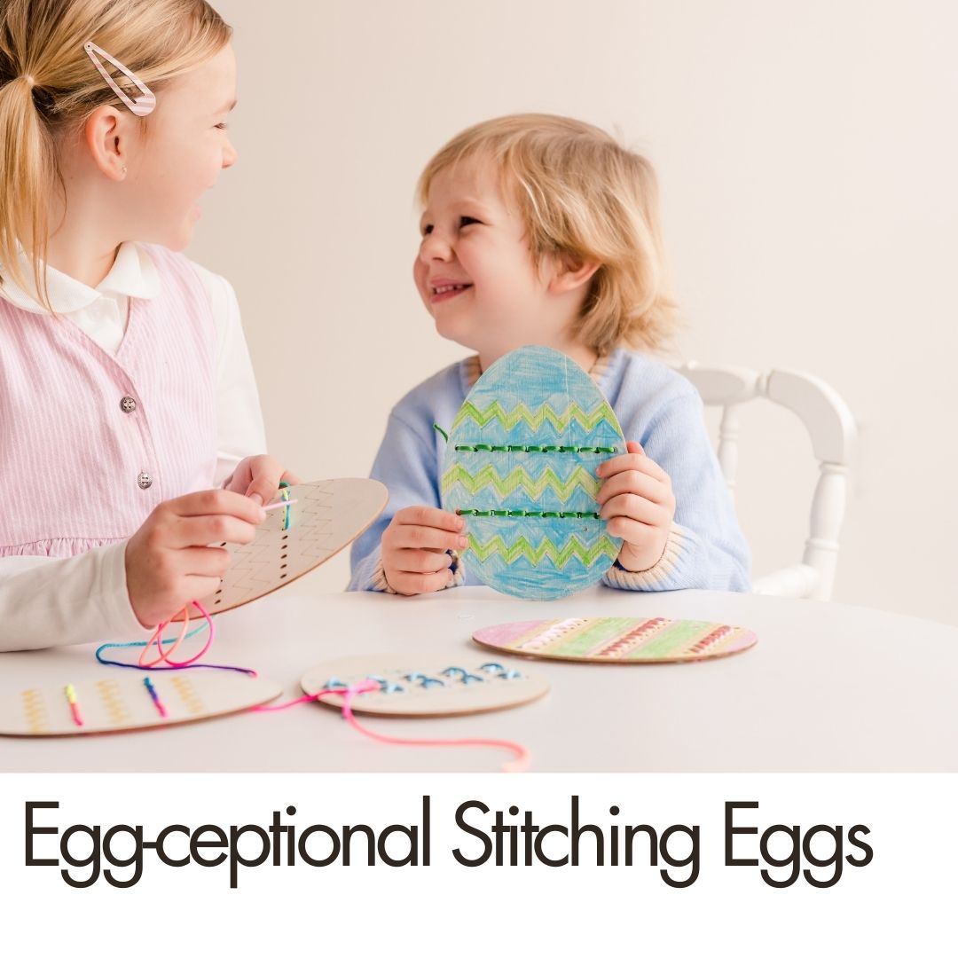 Kids stitch colorful designs onto wooden eggs while practicing fine motor skills and creativity. - 🎀 Happy Easter Banner