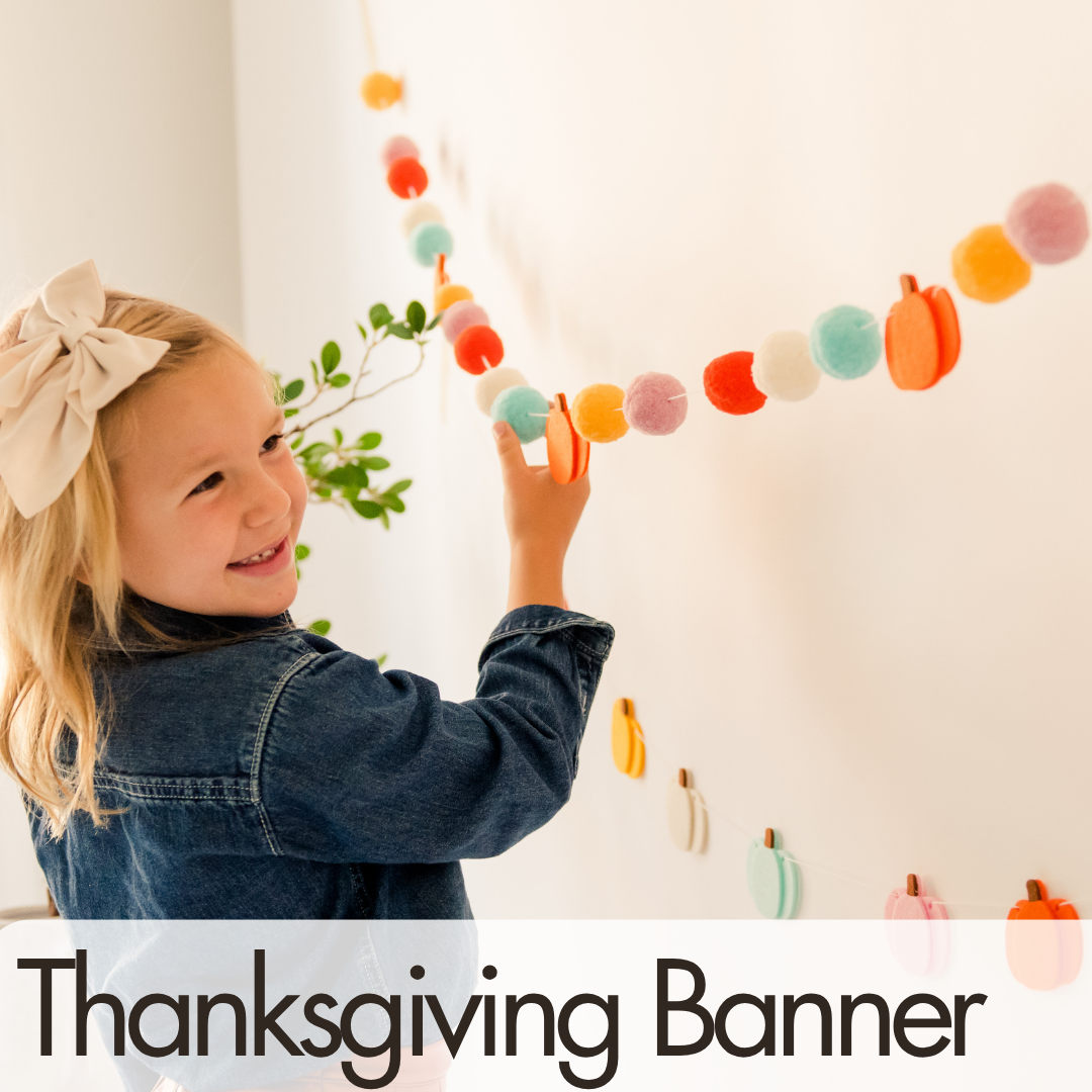 - Thanksgiving Banner – Add a cozy pop of color to your home with playful pumpkins and pom-poms.